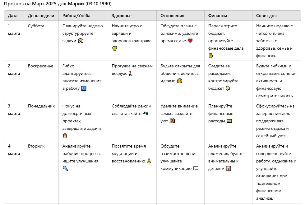 “Заказала прогноз на год и осталась очень довольна! Всё было детально и понятно, рекомендации на каждый день. Теперь знаю, когда лучше начинать новые дела, а когда стоит быть осторожнее. Это действительно помогает планировать жизнь и избегать неприятностей. Рекомендую всем, кто хочет лучше понимать, что ждать от будущего!” - Мария, 34 года